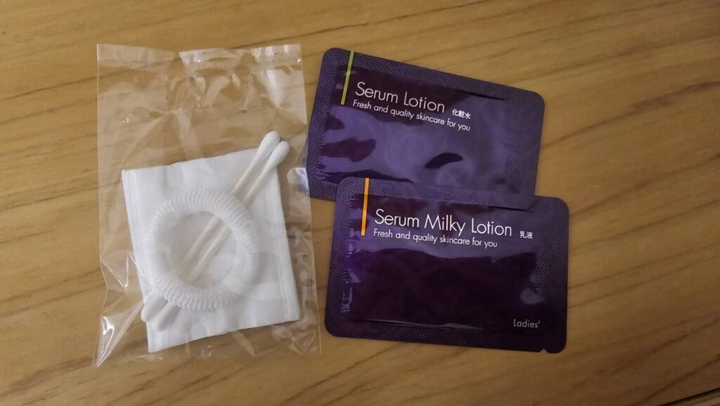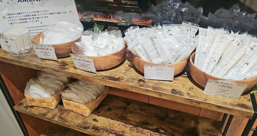 1階フロント前に、化粧水・乳液・コットンセット・レザー・ヘアブラシなど、一通りのアメニティが揃えられていて必要十分でした!