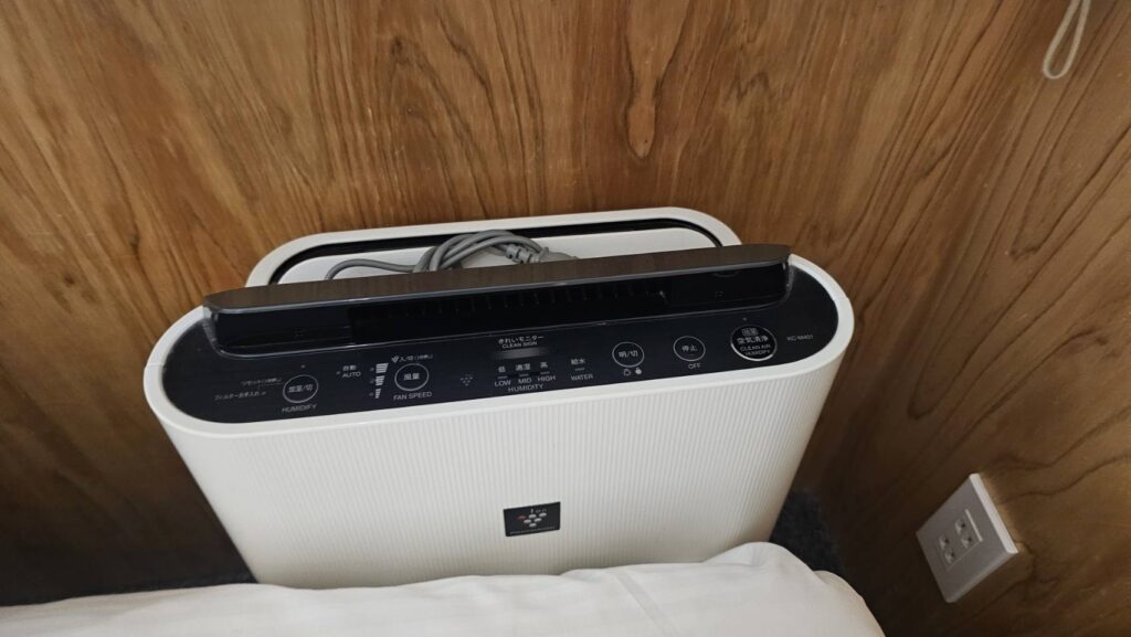 ベッドの奥には加湿器兼空気清浄機とコンセント、