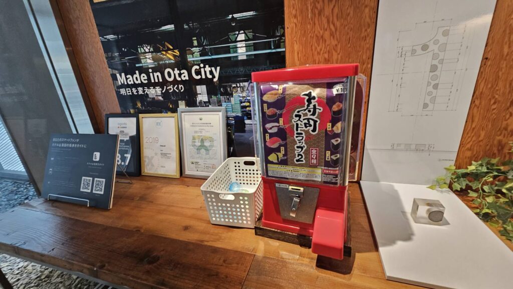宿泊客はほとんど外国人で、ロビーには寿司ストラップのガチャガチャや